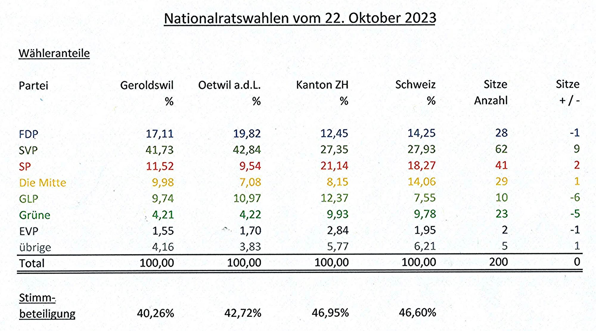 Aber auch unsere Ortspartei musste einen herben Verlust hinnehmen: Der Wähleranteil in Oetwil sank von 23,54% im Jahr 2019 um 3,72 Prozentpunkte auf noch 19,82%.